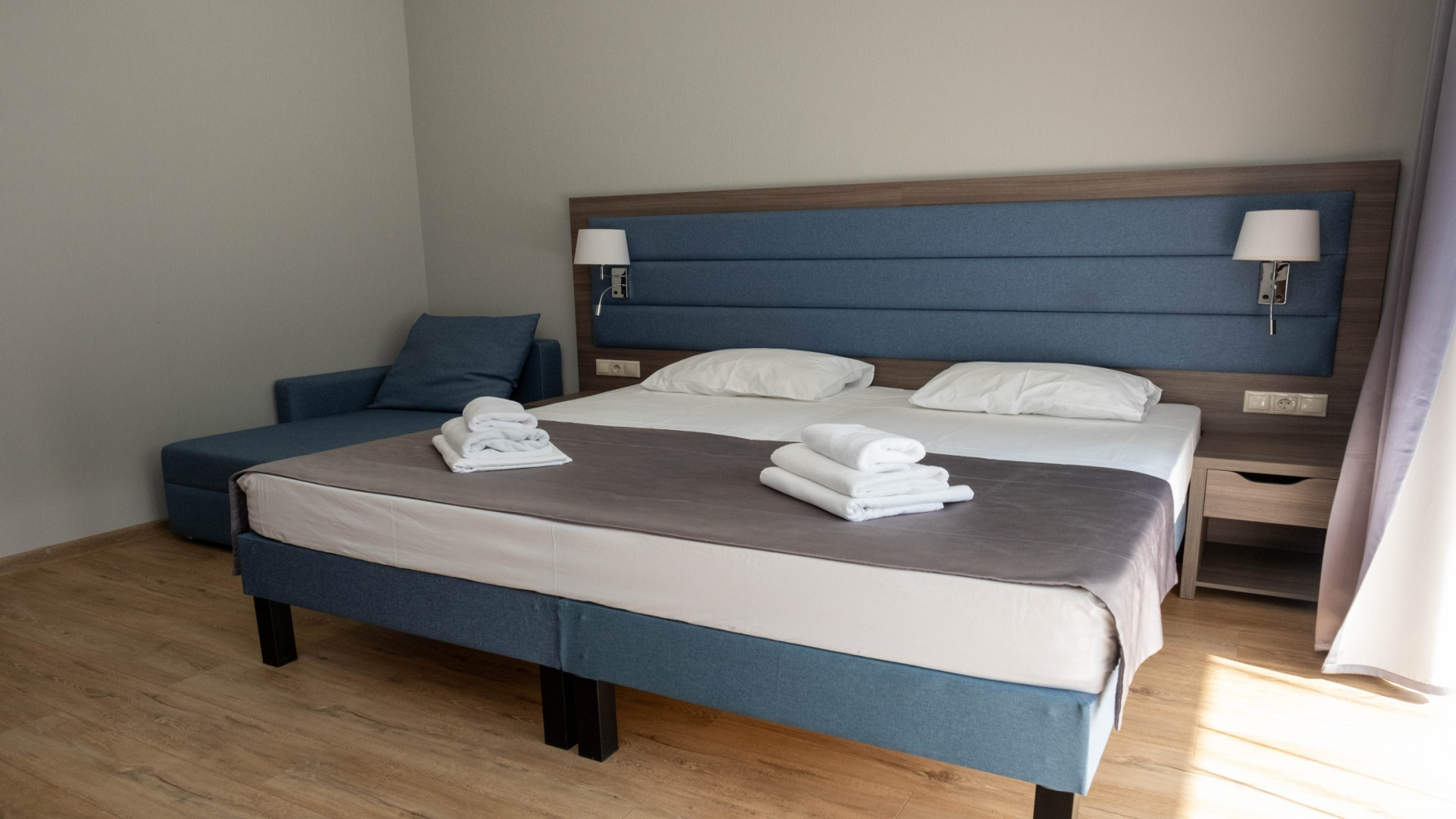 В номере: душ, туалет, ТВ, холодильник, кондиционер, фен, двуспальная или две раздельные кровати, балкон. размещения 1 гостя на доп. месте (диван)