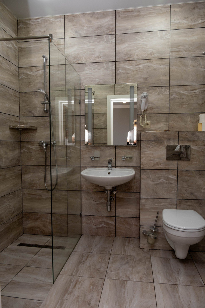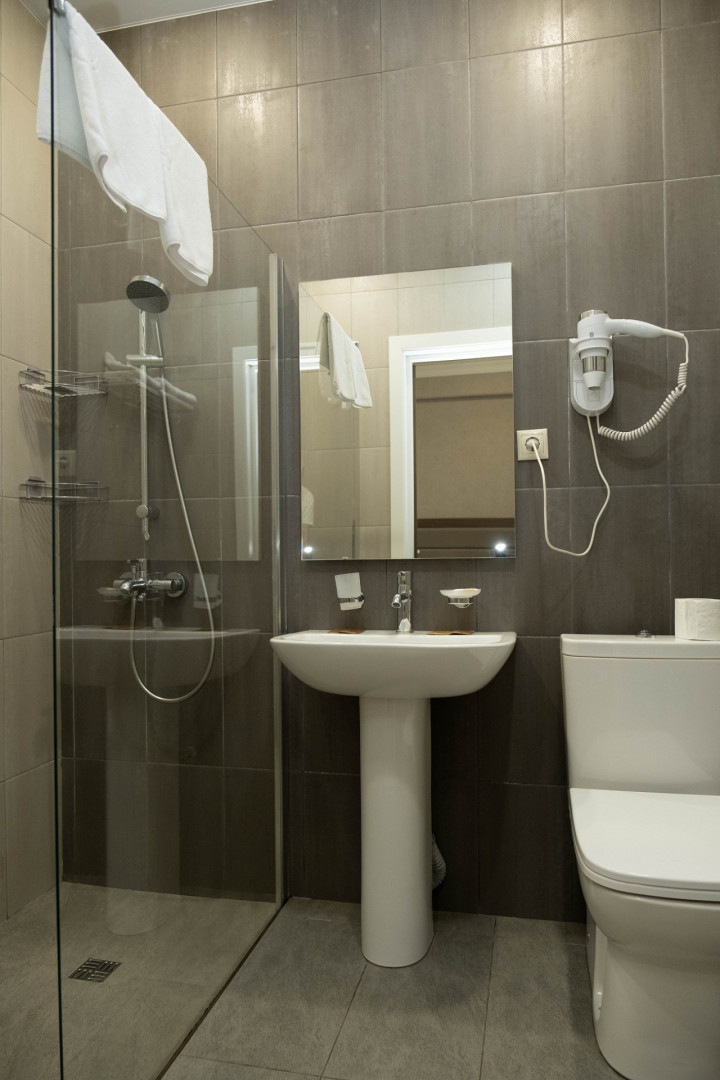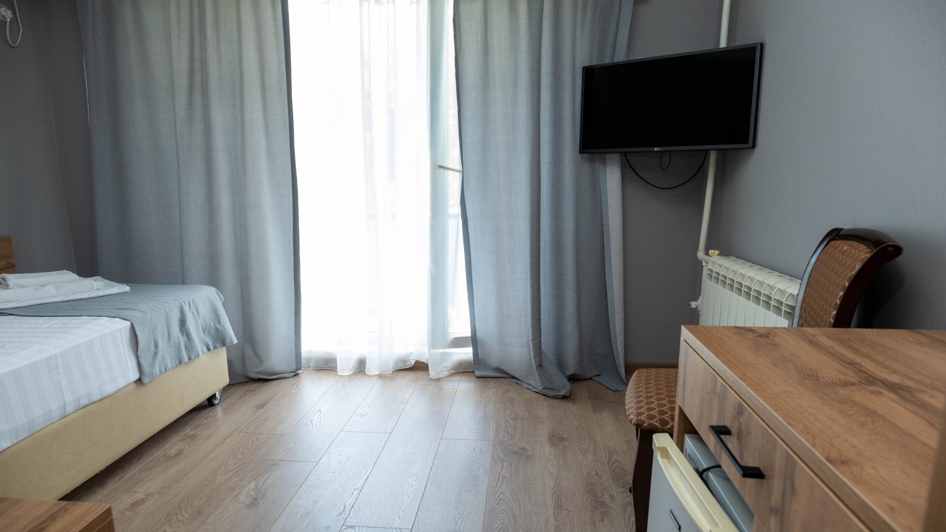 В номере: душ, туалет, ТВ, холодильник, фен, односпальная кровать, балкон