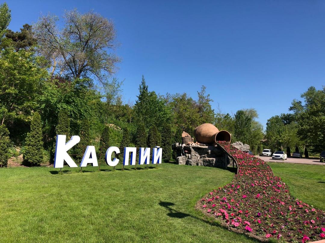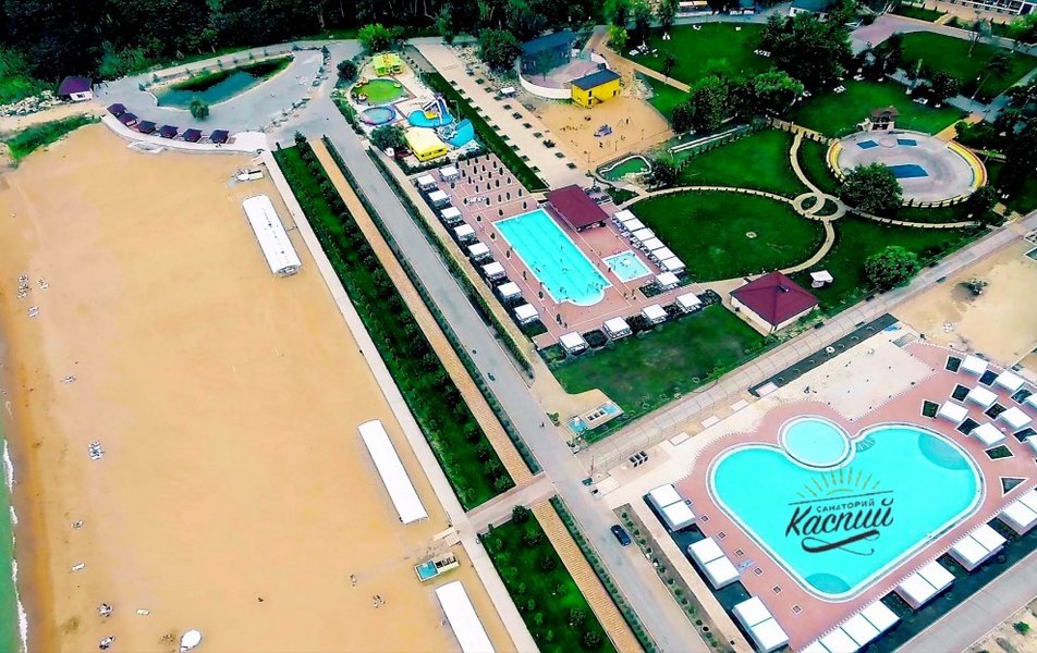 Санаторий занимает обширную благоустроенную территорию, раскинувшуюся на территории Манасского взморья, площадью 44 гектара. «Каспий» включает в себя 4 спальных корпуса в 4 и 5 этажей, отдельно стоящих коттеджей, несколько домиков-срубов и лечебный корпус. На территории санатория имеется три источника с минеральной водой и 60-метровый водный канал с дорожками для прогулок по воде. Гостей ожидают номера категории Эконом, Стандарт, Люкс, оснащенные санузлом, кондиционером и бытовой техникой.