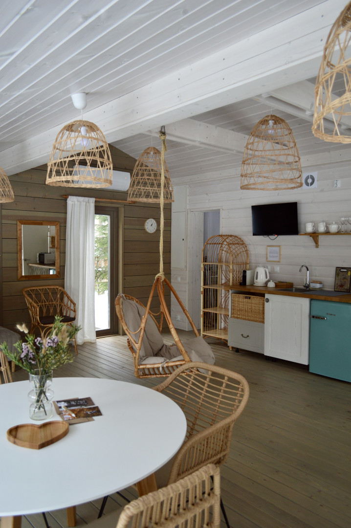 В коттедже: ванна, туалет, ТВ, холодильник, кондиционер, сейф, фен, мини-кухня, электрочайник, СВЧ-печь, двуспальная кровать, диван. Дом с особенной атмосферой, где хочется наслаждаться ароматом чая! Особенности номера: Панорамный дом с 1 спальной комнатой и гостиной-кухней.