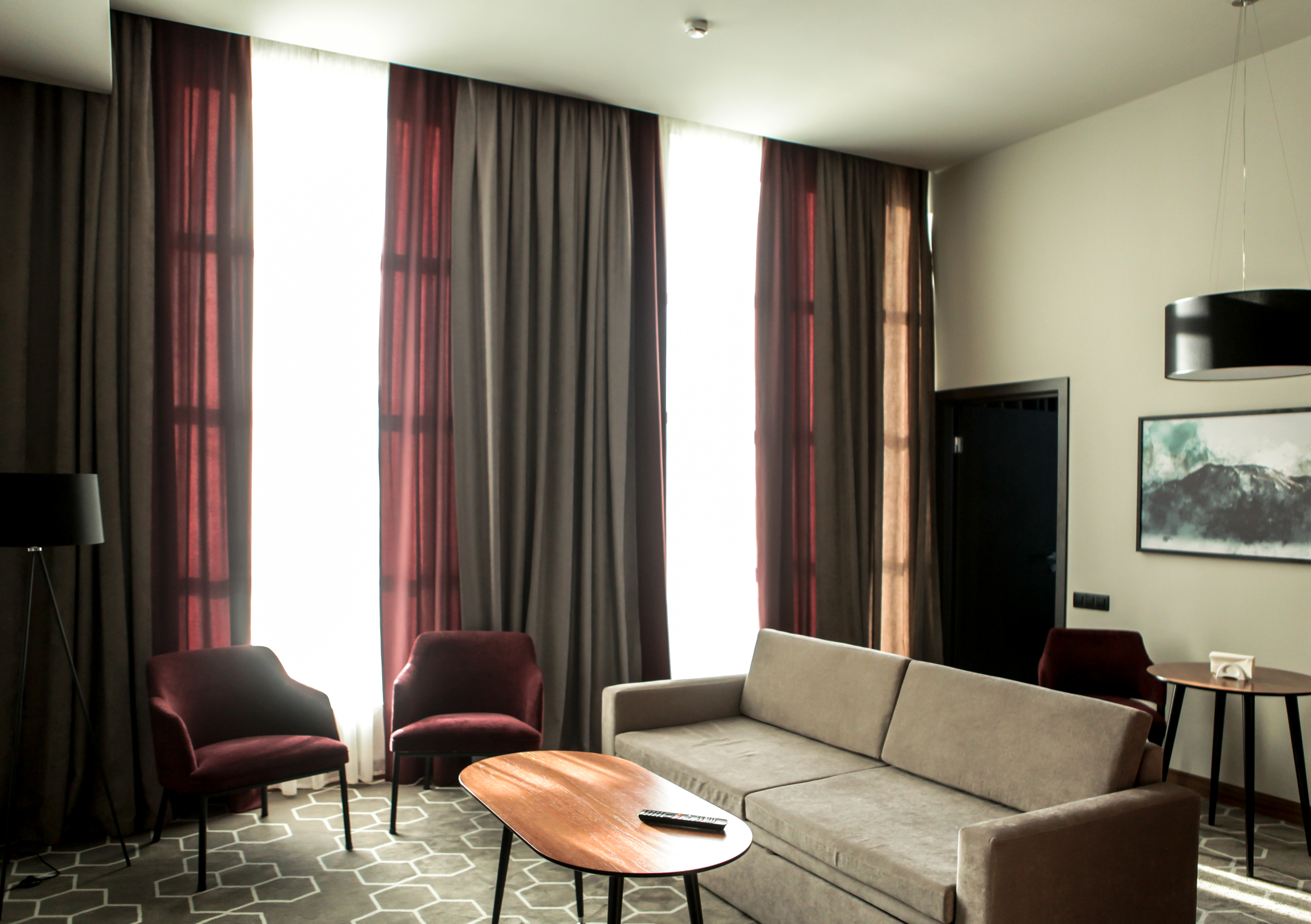 Все комнаты оформлены в современном стиле в приятных пастельных тонах с контрастирующим полуночным синим цветом стен и мебелью оттенка темной вишни. В гостиной есть удобный диван, который обеспечивает два дополнительных места для сна. Наличие телевизоров со спутниковыми каналами и Smart TV, беспроводной Wi-Fi и рабочая зона делает пребывание в номере комфортным как для туристов, так и для людей, посетивших город с деловой поездкой. Ванная комната порадует удобством и полным оснащением: душевая кабина, раковина, туалет, зеркало с подсветкой, биде, косметическое зеркало, фен, принадлежности для личной гигиены, гель и шампунь.