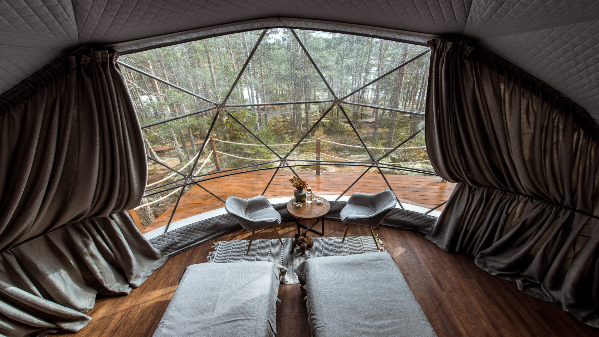 10 геокуполов, каждый рассчитан на 2-3 человека. Внутри две удобные нижние кровати или одна большая для пар и дополнительное спальное место наверху, прикроватный столик, два кресла и журнальный стол у панорамного окна с видом на лес и озеро. Также шкаф для одежды, розетки, биотуалет и раковина для умывания. Каждому гостю предоставляется два полотенца. В каждом куполе есть электропростыни и камин с автоматической подачей топлива.