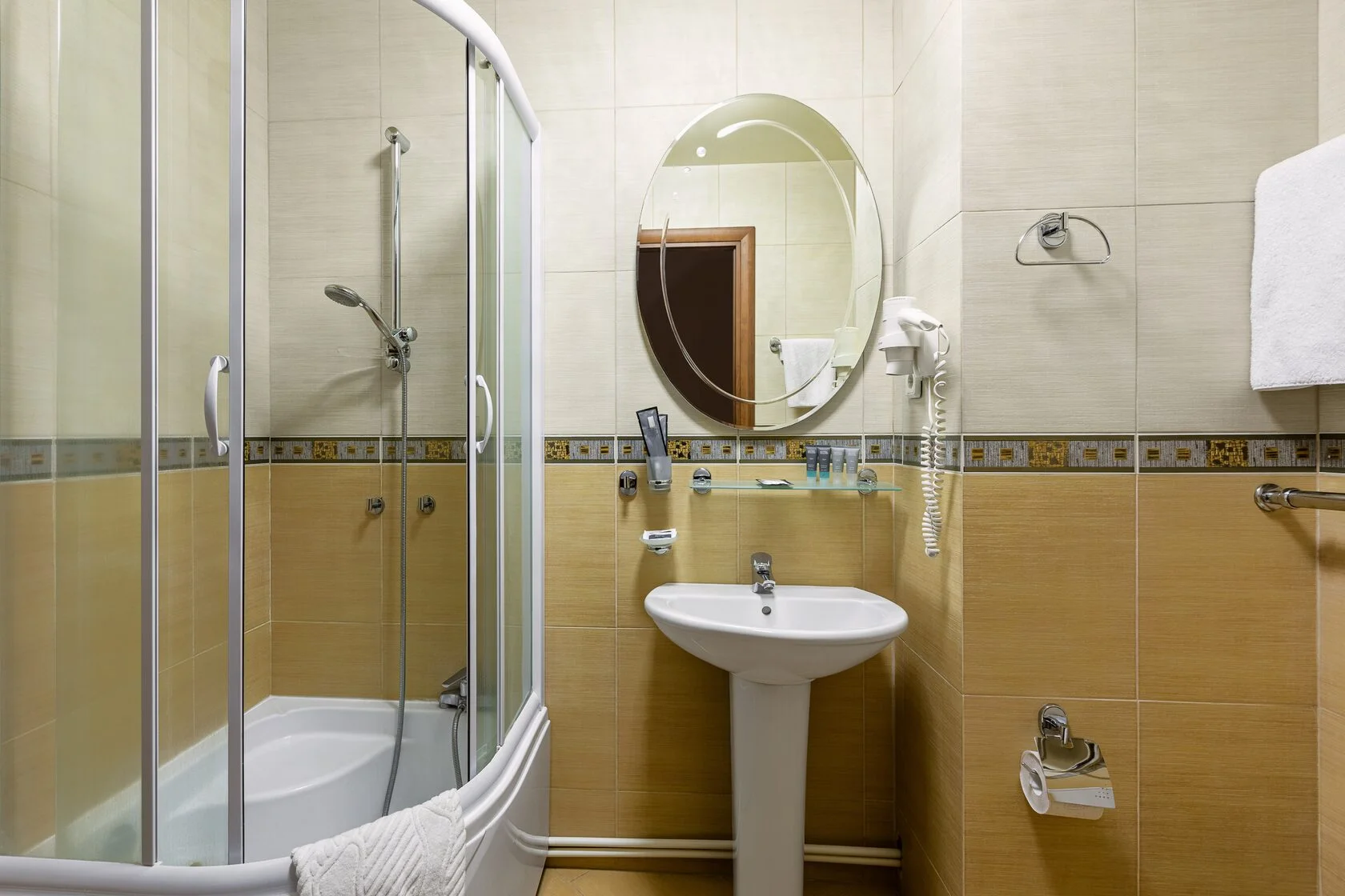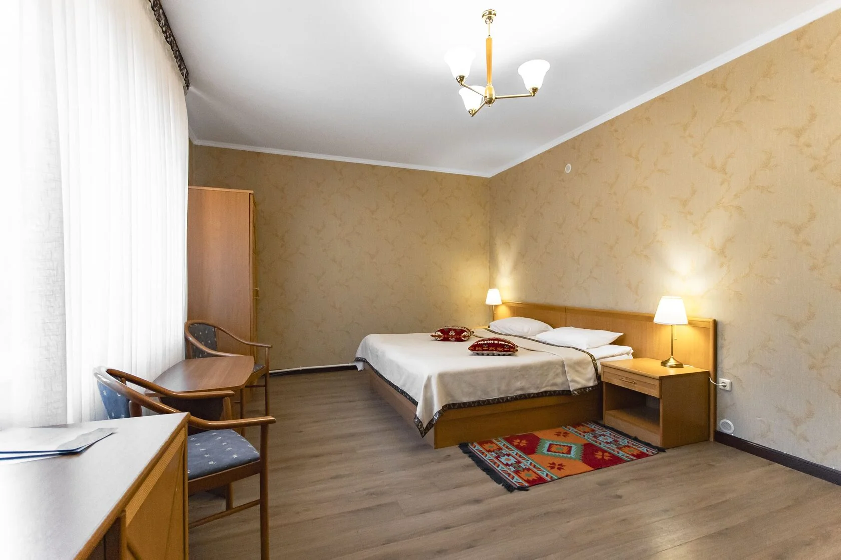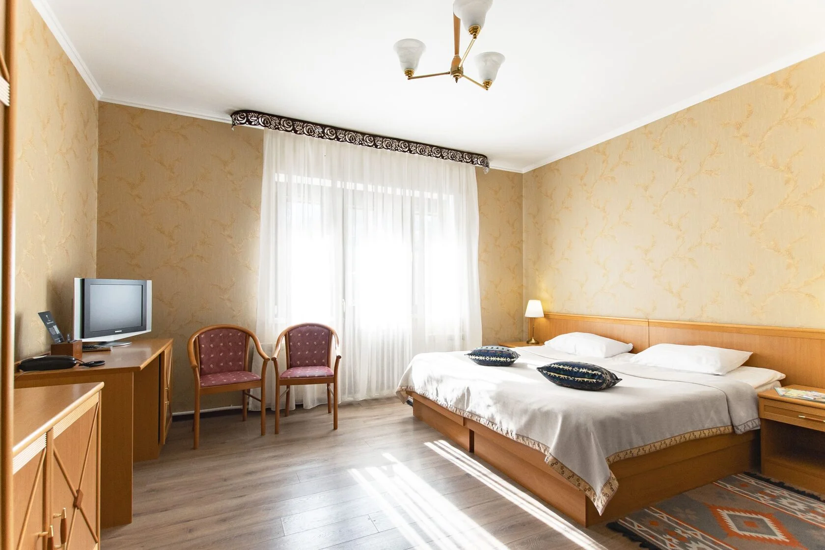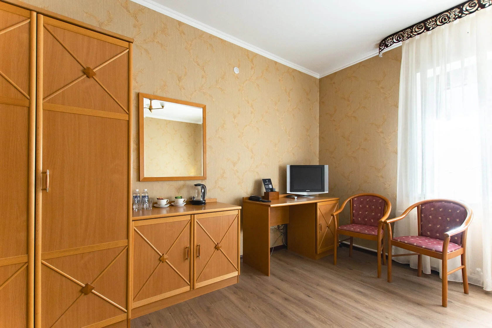 В номере: душ, туалет, ТВ, фен, телефон, чайная станция, двуспальная или две раздельные кровати, диван