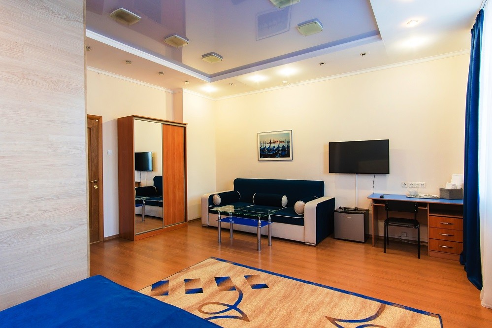 В номере: ванна, туалет, биде, ТВ, холодильник, кондиционер, фен, мини-кухня, электрочайник, СВЧ-печь, двуспальная кровать, диван