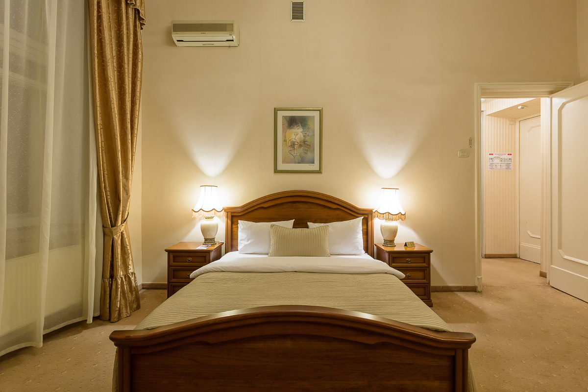 В номере: ванна, туалет, биде, ТВ, холодильник, кондиционер, сейф, фен, телефон, электрочайник, двуспальная или две раздельные кровати, диван