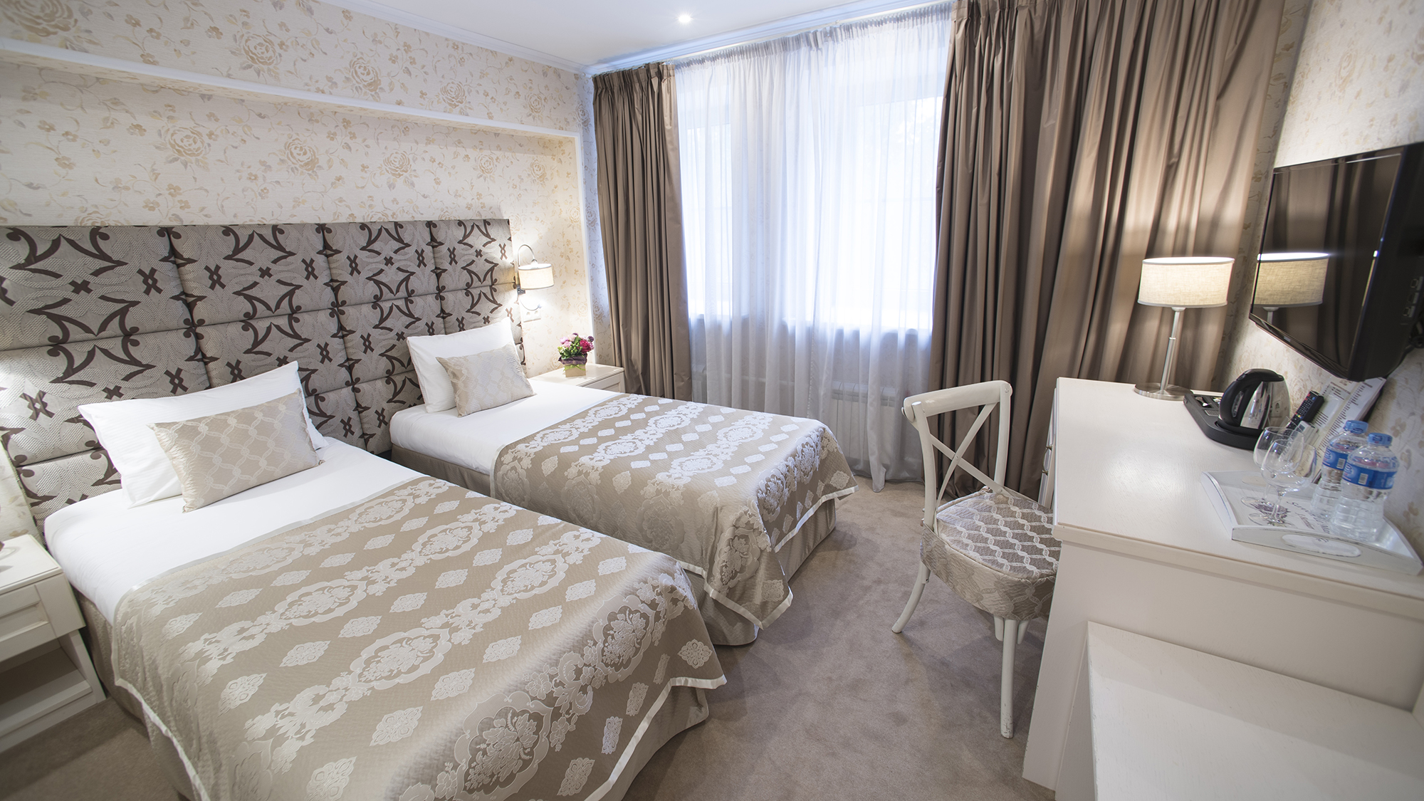 В номере: ванна, туалет, ТВ, холодильник, кондиционер, фен, телефон, электрочайник, две раздельные кровати