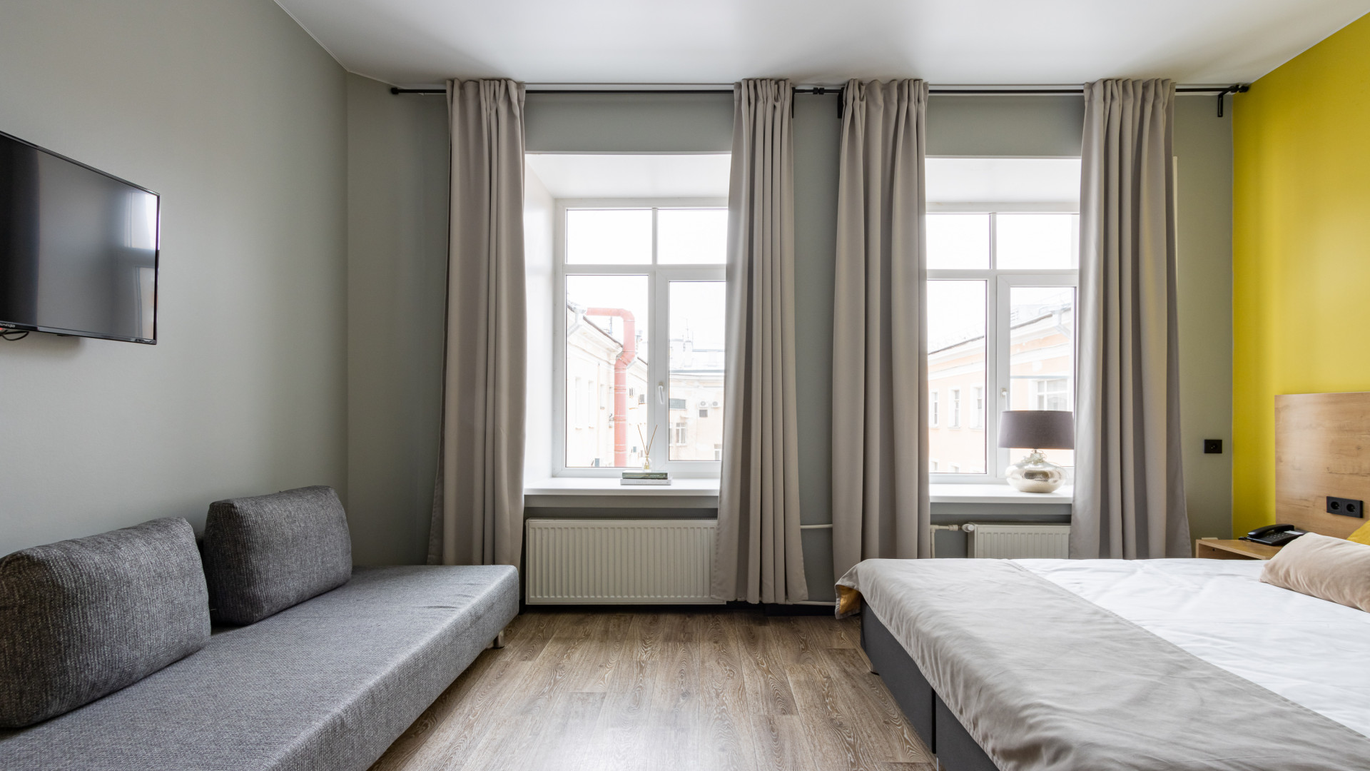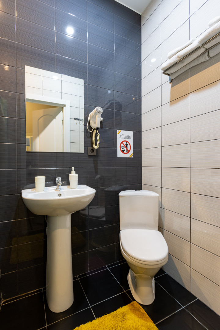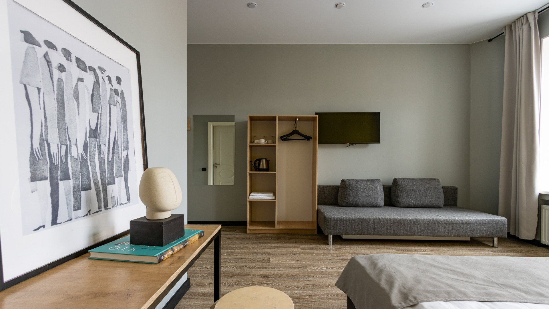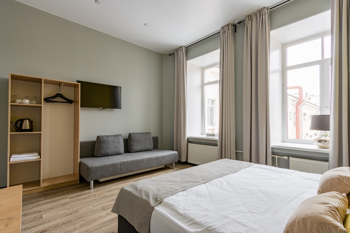 В номере: душ, туалет, ТВ, фен, телефон, электрочайник, двуспальная или две раздельные кровати, диван