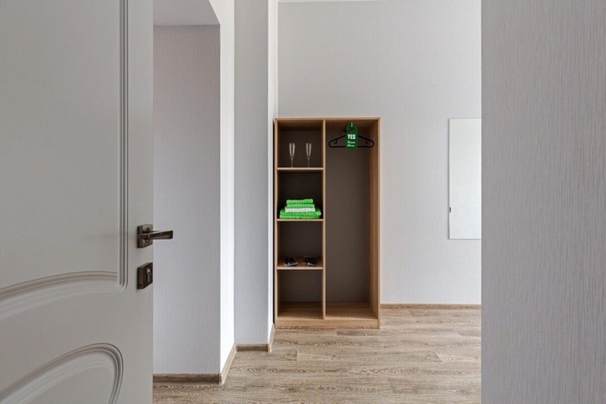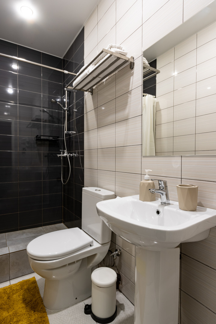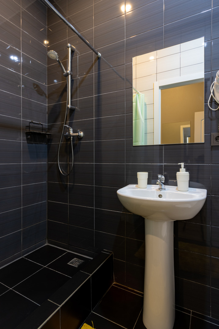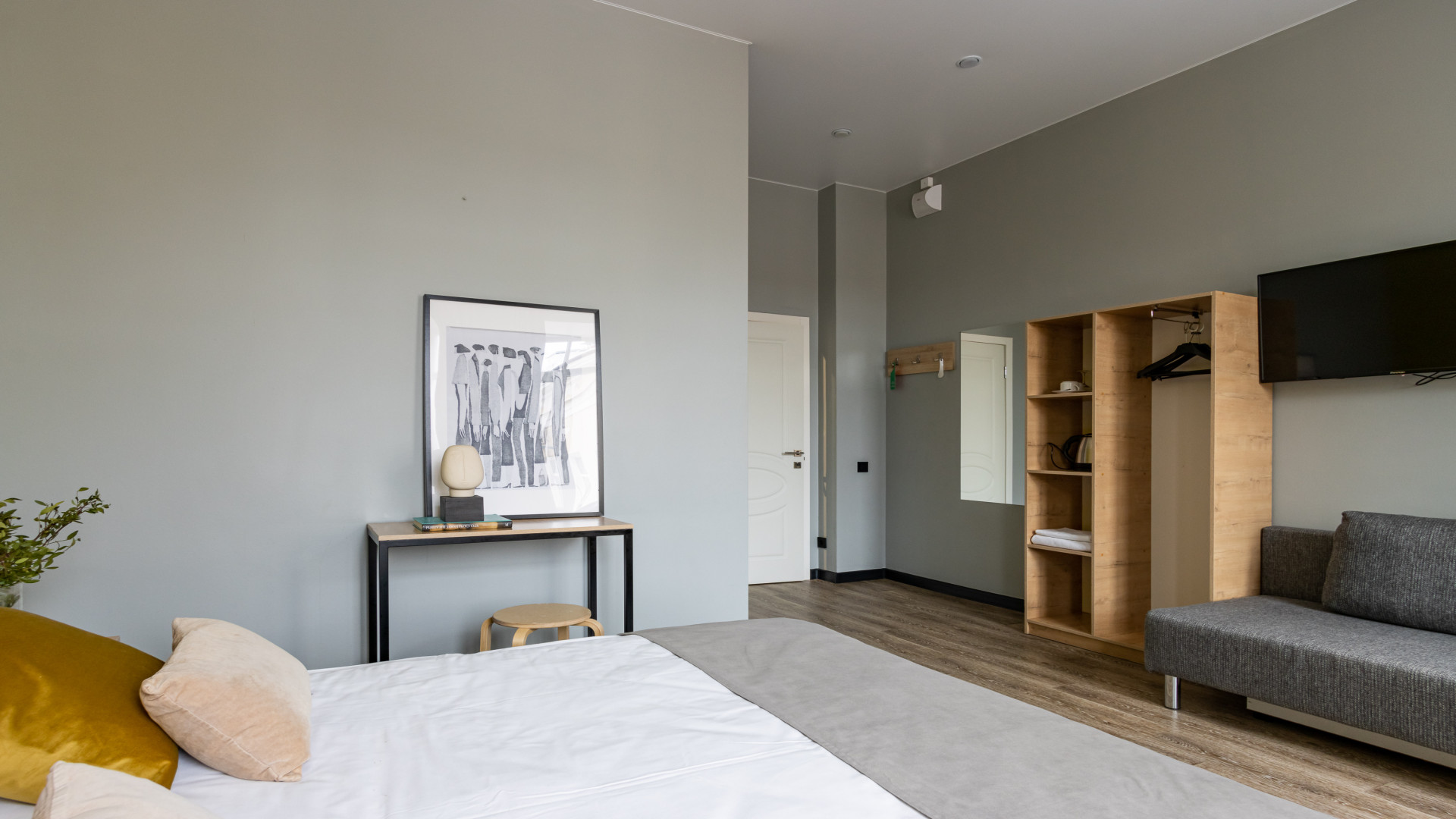 В номере: душ, туалет, ТВ, холодильник, сейф, фен, телефон, мини-кухня, электрочайник, СВЧ-печь, двуспальная кровать, диван